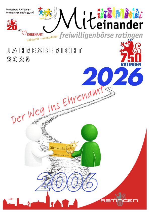 Freiwillige, die bereits 25 Jahre und mehr ehrenamtlich tätig sind, haben die Möglichkeit, die „Jubiläums-Ehrenamtskarte NRW“ bei der Miteinander.Freiwilligenbörse Ratingen e.V. zu beantragen.